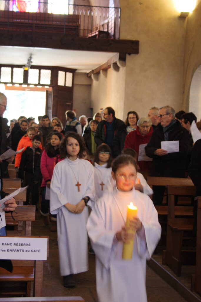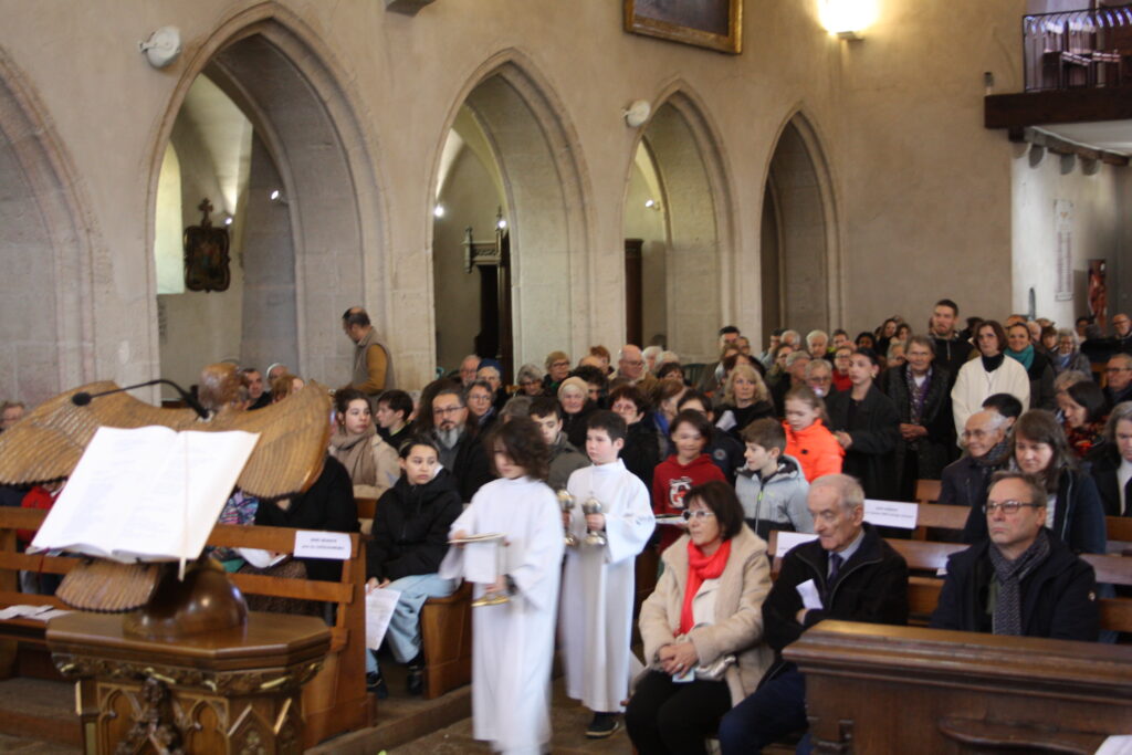 Après le catéchisme, la messe a été célébrée à l’église de Clairvaux. Les maires de Clairvaux-les-Lacs, Mme Hélène, et de Lect, M Dominique, étaient présents à la célébration eucharistique. Plusieurs maires avaient également envoyé leurs représentants. Madame la députée Marie-Christine DALLOZ a adressé un message à l’occasion de la bénédiction de la nouvelle paroisse. Étaient aussi présents en grand nombre : les accompagnateurs des jeunes et de l’aumônerie, l’équipe du SEM, les équipes de préparation au baptême, au mariage et aux obsèques, les membres de la chorale, les parents et les enfants du catéchisme, ainsi que les catéchumènes.