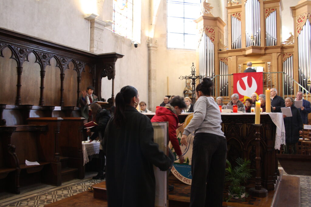Au moment de la procession des offrandes, les enfants du catéchisme, un membre du SEM et de l’équipe des obsèques, ainsi qu’un couple de la préparation au mariage, ont apporté les offrandes depuis le fond de l’église.