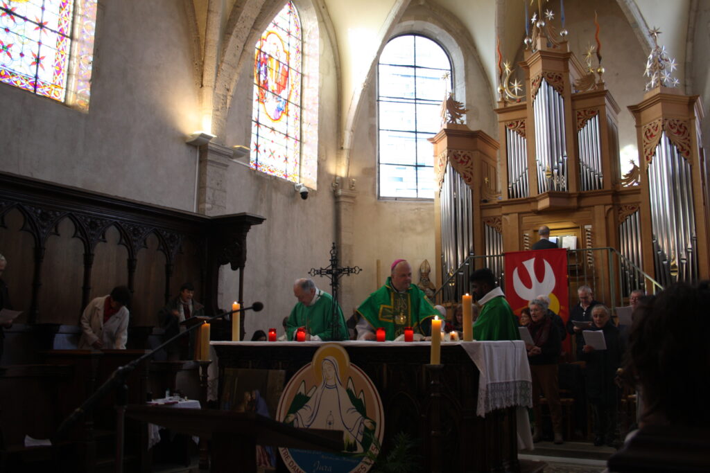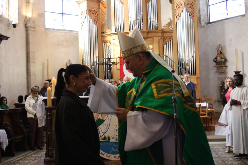 Après l’homélie, Mgr Jean-Luc Garin a béni Defné, catéchumène présente ce jour-là, et l’a ointe avec l’huile des catéchumènes. Les cinq catéchumènes de la nouvelle paroisse – Marion FARINETTI, Perrine MARCEL-MILLET, Dalvynia PERONO, Defné BAG et Mylène BODOIGNET – seront baptisées par immersion lors de la veillée pascale à l’église de Clairvaux.