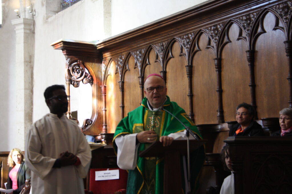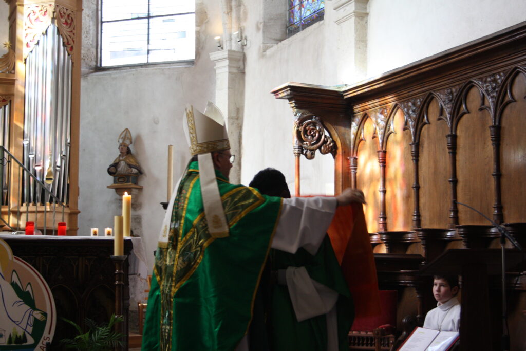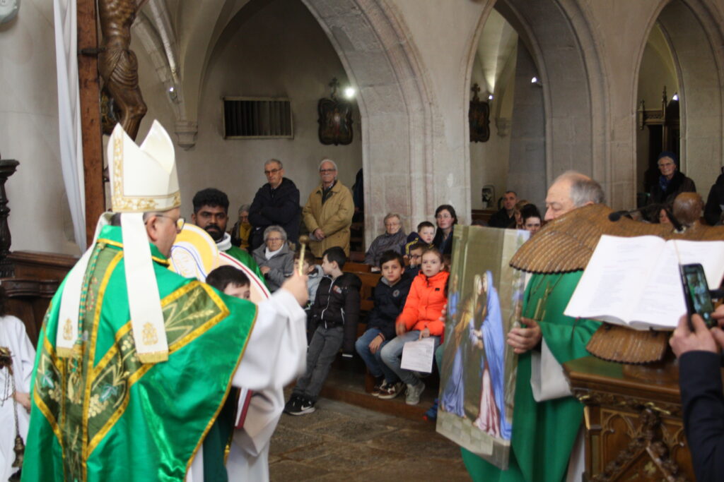 Au début de la célébration, le curé, le père Jegani AROCKIASAMY, a lu le décret d’érection canonique de la nouvelle paroisse. Ensuite, Mgr Jean-Luc GARIN a béni le sceau et le nouveau logo de la paroisse Notre-Dame des Monts et des Lacs.