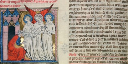 L’autre est une enluminure de la Bible de GUYARD des MOULINS (1251-1332) écrite en français et traduite de la Vulgate de St JEROME. A Mambré, Abraham et les trois anges.