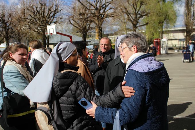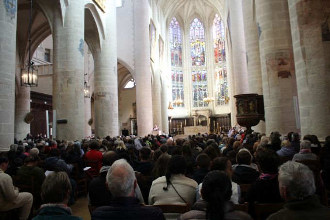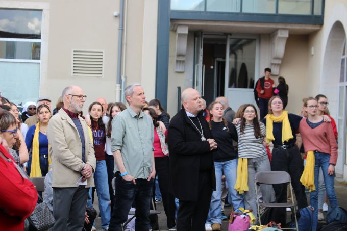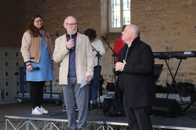C’est aussi par lui, et le pasteur Florian Rochat du réseau évangélique RSL, que cet événement dans l’Unité a pu avoir lieu. Tous deux, peu après l’arrivée de Mgr Garin à St-Claude, avaient eu l’intuition d’œuvrer ensemble pour l’évangélisation de la jeunesse par un concert de Glorious. Cette intuition initiale s’est développée, amenant un comité œcuménique et intergénérationnel de 20 personnes à se former, pour construire toute une journée au collège Mt Roland avant le concert. Après la messe à la collégiale (700 personnes !) et le culte au collège (120 personnes), celle-ci a réuni 300 personnes, dans une ambiance festive et simple. Au programme : temps convivial et chantant autour d’un apéritif puis d’un repas, ateliers (21 propositions diverses : Foot, Les charismes, Louer Dieu par Sa création, Témoignages de visiteurs en prison, …), puis prière commune dans l’Unité en guise d’envoi vers la Commanderie.