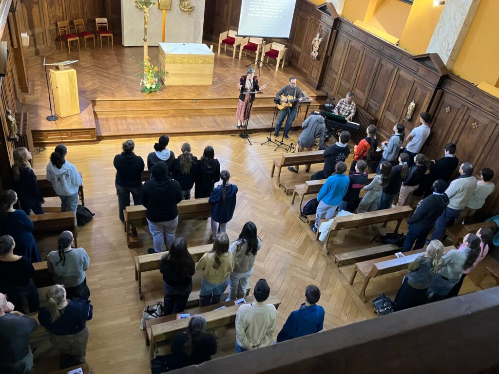 Samedi 15 novembre 2025, accompagnés par leurs animateurs, une soixantaine d’adolescents se préparant à la confirmation ou au baptême se sont retrouvé à la maison diocésaine à Poligny. La journée a commencé par un temps de prière de louange, puis par petit groupe, les jeunes ont participé à deux ateliers : l’un sur l’Eucharistie et l’autre sur l’Esprit Saint. Après un repas convivial, ils ont joué à un grand jeu dont le but était de revisiter l’histoire sainte du peuple Hébreux. Puis le temps de méditation à partir du « tryptique de Pentecôte » a permis d’approfondir les essentiels de la vie chrétiennes ainsi que les sacrements. En recevant l’Esprit Saint, les jeunes disent « oui » à la confirmation, « « oui » pour qu’IL guide toute leur vie. C’est LUI qui nous fait ressembler à Jésus et vivre comme lui ! Cette journée était aussi une occasion pour les jeunes de rencontrer l’évêque Mgr. Jean-Luc Garin. Ensemble, ils ont partagés un temps de question-réponses spontanées. Quelques jeunes ont aussi partagé ce qu’ils avaient vécu à Lourdes et témoignés de comment ce pèlerinage les a profondément marqués. Cette belle journée, s’est terminée par une procession aux flambeaux jusqu’au monastère Sainte-Claire où une veillée de louange – adoration, animée par le groupe « Agape Mission » a lieu. Les jeunes étaient invités à déposer au pieds du Seigneur un talent/un don qu’ils souhaiteraient voir fructifier au service du Christ et de l’Eglise.