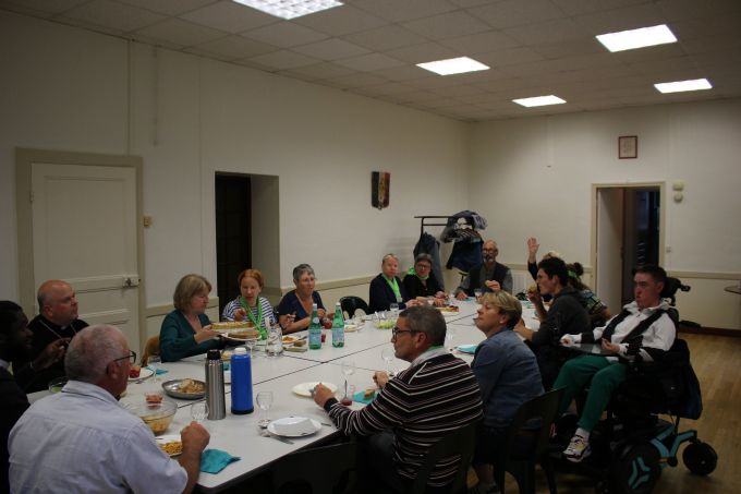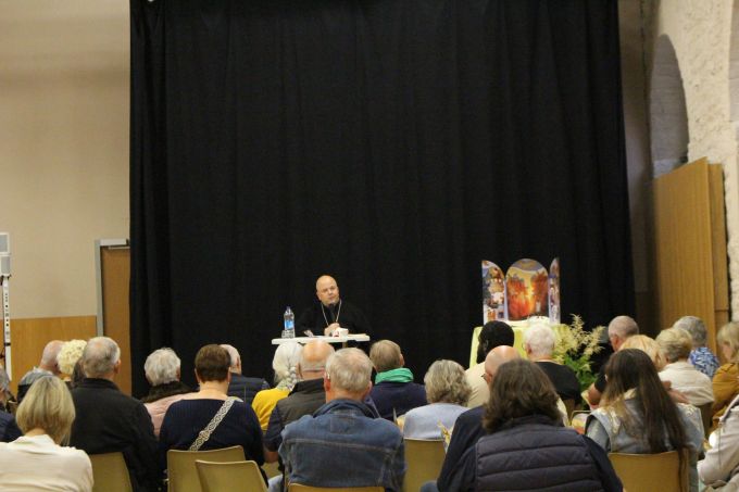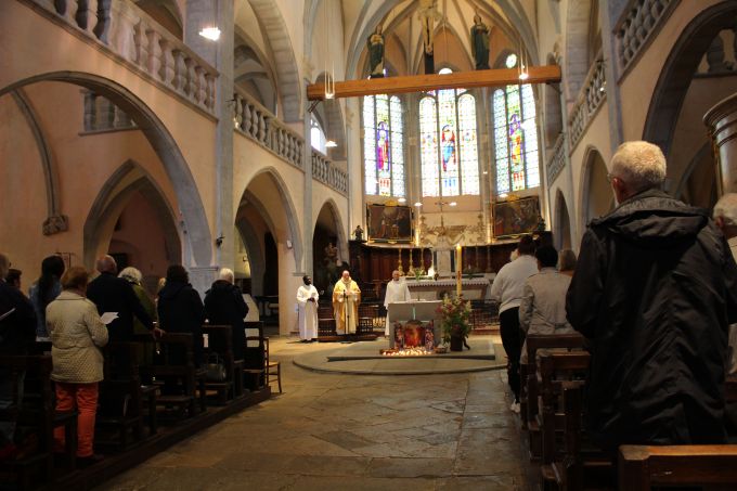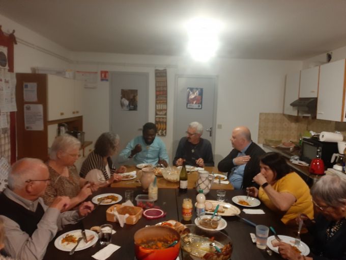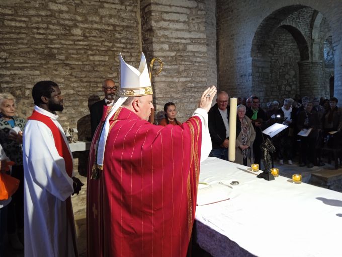 « Nous avons vécu une Visitation pastorale sur la durée, prenant le temps de rencontrer les personnes et de tisser des liens fraternels entre les services du diocèse et les paroissiens », salue Mgr Garin qui invite à poursuivre « la mission de toute paroisse qui est de visiter, consoler et encourager ». Au cours de cette semaine, l’évêque, la FMD et des personnes de la paroisse sont allés à la rencontre des jeunes avec un « caté-crêpes-louange » et d’un foot suivi d’échanges, mais aussi à la rencontre des élus, des agriculteurs sur la ferme des Muscadets à Pimorin et la ferme Van Donselaar à Gigny, des associations à Arinthod, des lieux de précarité, comme le groupe de solidarité Les Bernaches porté par le Secours catholique à Orgelet. Ils sont aussi allés visiter des personnes seules et âgées qui le demandaient, à leur domicile et dans les Ehpad, ou encore bénir les maisons. Le temps passé au Foyer Ma Maison à Aromas a réjoui tous les participants : personnes en situation de handicap, personnels et visiteurs. Des animations ont été proposées sur les marchés de Saint-Julien, Arinthod et Orgelet avec discussions autour d’une boisson et possibilité d’aller se recueillir dans les églises toutes proches. Cette semaine a été ponctuées de moments conviviaux, de petits déjeuners et repas où les habitants des villages se retrouvaient pour échanger mais aussi de célébrations. Chacun a pu redécouvrir et admirer les belles églises bien entretenues aux quatre coins du doyenné et faire une halte au Carmel de Saint Maur qui accueillait le rassemblement des équipes du Service de l’Evangile auprès des personnes malades. Jeudi, la veillée de consolation et d’adoration dans l’église de Chamberia a permis à chacun de déposer une peine ou une intention de prière. Une intention particulière a été portée pour les familles endeuillées par la perte d’un jeune sur les routes de la Petite Montagne. La messe de clôture de la visitation, dans l’église de Saint-Hymetière, a rassemblé les cinq paroisses du doyenné appelées à ne former plus qu’une seule paroisse en janvier 2026. Un appel à l’unité encouragé par Mgr Garin et le père Denis, curé du doyenné. Pendant la messe, l’assemblée a aussi eu la joie de célébrer un baptême et la peine d’apprendre le décès du papa du père Denis au Sénégal. « C’est aussi votre pasteur que je vous invite maintenant à visiter, consoler et encourager », ajoute Mgr Garin. Le père Denis sera rejoint en septembre par deux autres prêtres, le p. Marc Auguste et le p. Michel, eux aussi originaires du diocèse de Thiès au Sénégal.