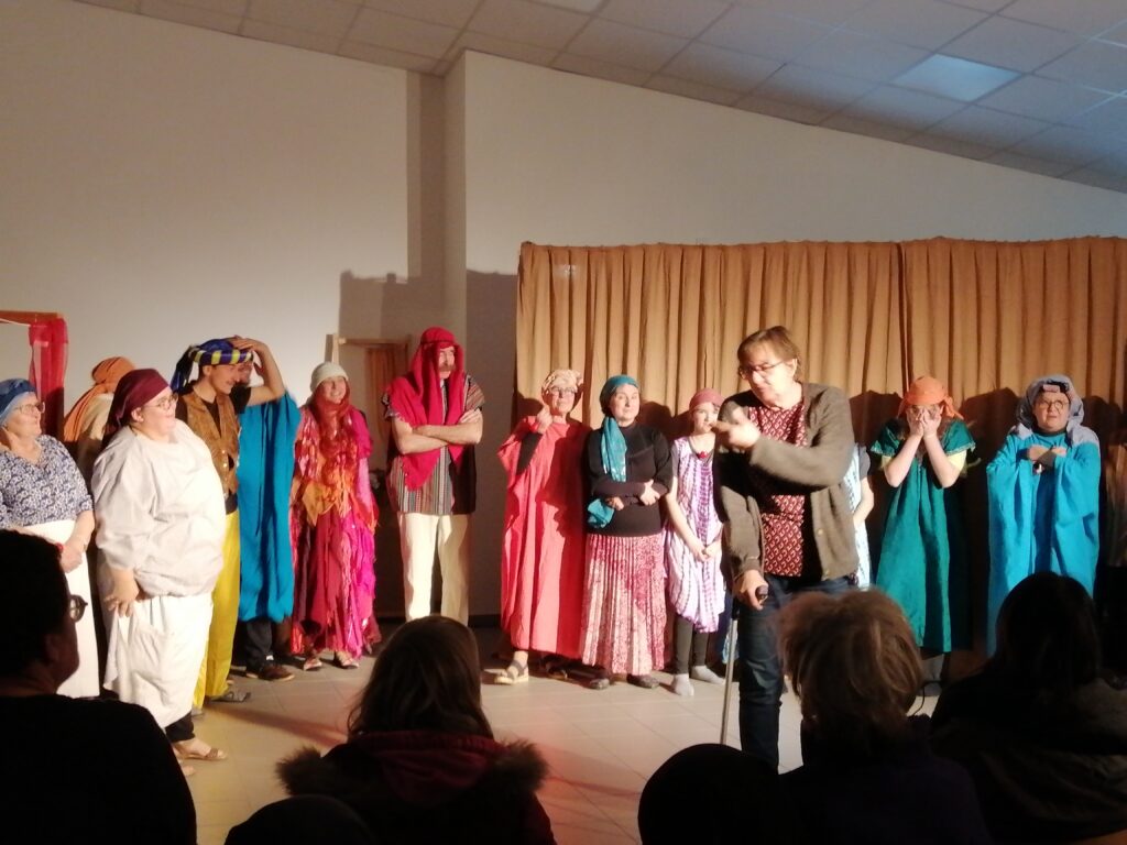 Avant de clôturer l’après-midi autour de bonnes galettes, la troupe de théâtre diocésaine « La Compagnie de l’Etoile » a joué pour nous et pour les carmélites l’histoire de la Samaritaine… plus d’un rire ont résonné dans la pièce ! Et l’on dit que des larmes d’émotion auraient couler à plusieurs reprises.